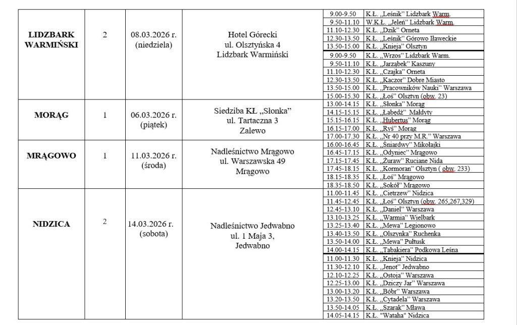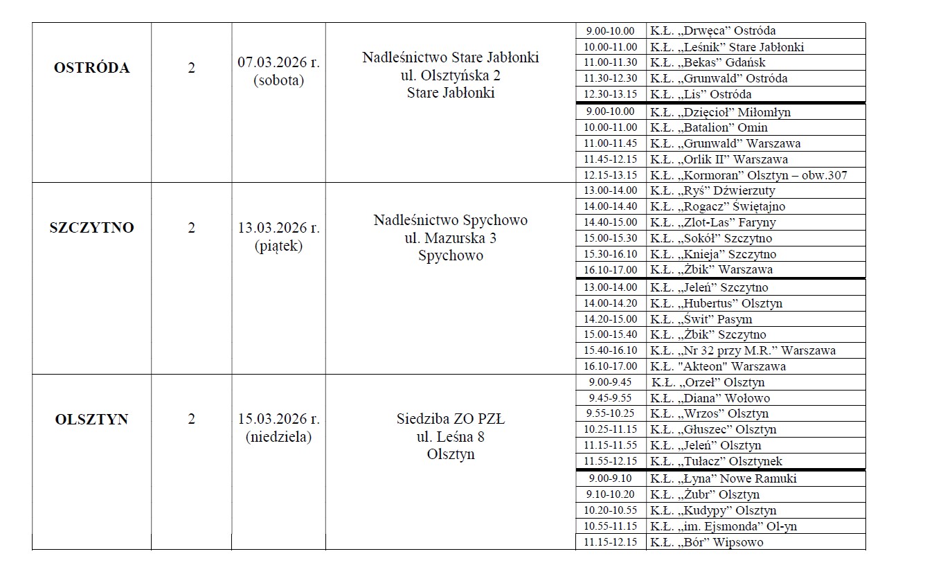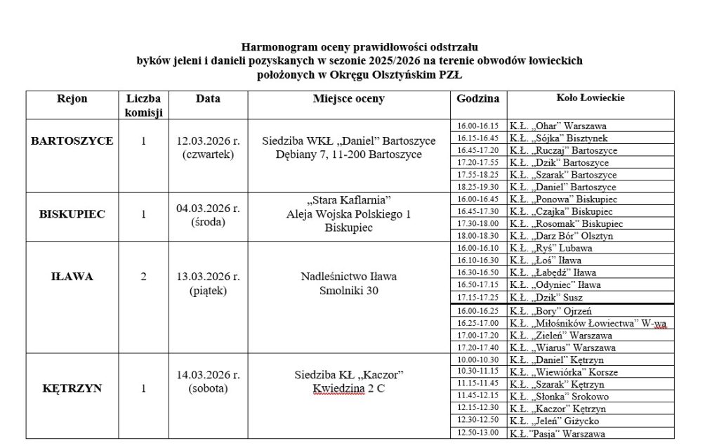 Zarząd Okręgowy uprzejmie informuje, że na podstawie art. 42d. ustawy z dnia 13 października 1995 r. Prawo łowieckie, uchwały nr 582 Naczelnej Rady Łowieckiej z dnia 15 lutego 2023 r. oraz uchwały nr 1/9/2026 Zarządu Okręgowego PZŁ w Olsztynie z dnia 22.01.2026 r. w sprawie przeprowadzenia oceny prawidłowości odstrzału, w dniach 2-15 marca 2026 r. zostanie przeprowadzona ocena prawidłowości odstrzału byków jeleni szlachetnych i danieli odstrzelonych w roku gospodarczym 2025/26 na terenie obwodów łowieckich leżących w olsztyńskim okręgu PZŁ. Ocena będzie połączona z wyceną medalową. Prosimy dzierżawców obwodów łowieckich o zapoznanie się z załączonym harmonogramem oceny, a zwłaszcza kolejnością kół w poszczególnych rejonach oraz o punktualne przybycie na miejsce oceny.