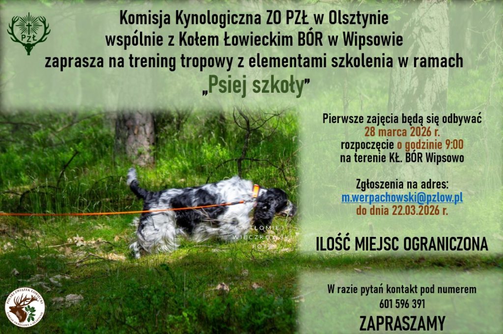 Komisja Kynologiczna ZO PZŁ w Olsztynie wspólnie z Kołem Łowieckim BÓR w Wipsowie zaprasza na trening tropowy z elementami szkolenia w ramach „Psiej szkoły”.