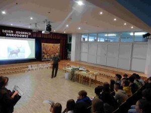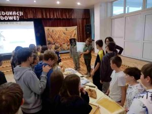 W dniu 03.11.2025 r. na zaproszenie dyrekcji Szkoły Podstawowej nr 5 w Iławie im. Polskich Noblistów członkowie Komisji Promocji, Tradycji i Kultury Łowieckiej Koła Łowieckiego „Dzik” w Suszu w osobach kol. Zbigniew Kołodziejskiego, kol. Doroty Kisieliczyn oraz kol. Michała Kaczyńskiego przeprowadzili zajęcia o tematyce łowiecko – pszczelarskiej. W spotkaniu wzięła udział kl. VI a – wych. Pani Ewa Tyszkiewicz oraz kl. VII c – wych. Pani Edyta Wojnowska. Część dotyczącą szeroko pojętego łowiectwa przeprowadził kol. Zbigniew Kołodziejski. Podczas prezentacji omówiono podstawy prawne na jakich działa PZŁ, czym zajmuje się łowiectwo /nie tylko polowanie/, kultura, tradycja i obyczaje m.in. legenda św. Huberta, ślubowanie i pasowanie na myśliwego, sygnalistyka łowiecka, gwara łowiecka, zaprezentowano rodzaje urządzeń łowieckich oraz fotografie z działalności komisji. Druga prezentacja dotyczyła wybranych ssaków oraz ptaków zamieszkujących nasze lasy z ich odgłosami, tropami oraz filmami. Drugą część naszego spotkania o tematyce pszczelarskiej przeprowadziła kol. Dorota Kisieliczyn przedstawiając prezentację multimedialną. W trakcie zajęć zaprezentowano strój pszczelarza, była degustacja miodu, uczniowie samodzielnie wykonywali świeczki w wosku pszczelego. Dużą satysfakcją było nagrodzenie nas gromkimi brawami przez uczestników spotkania.
